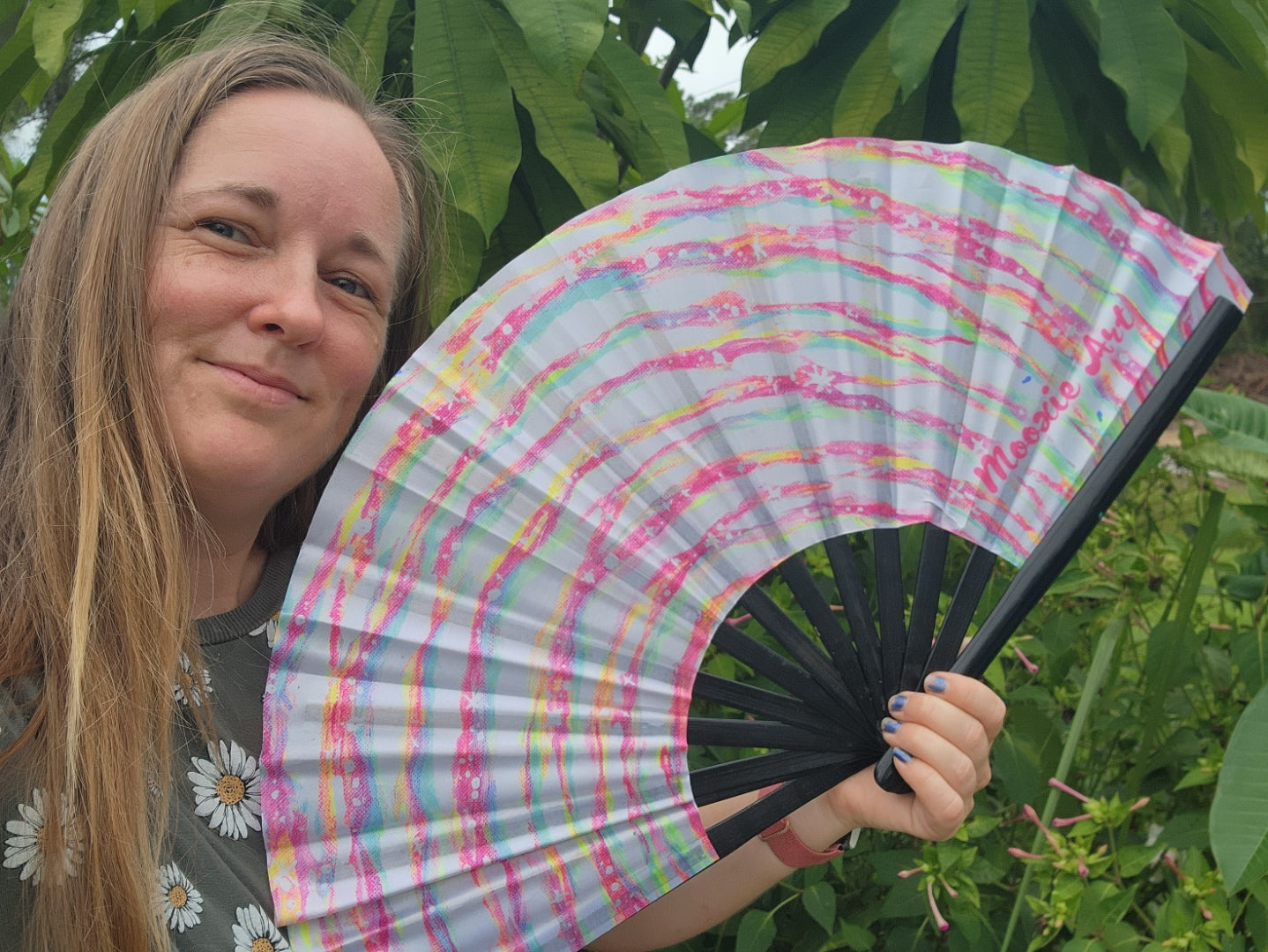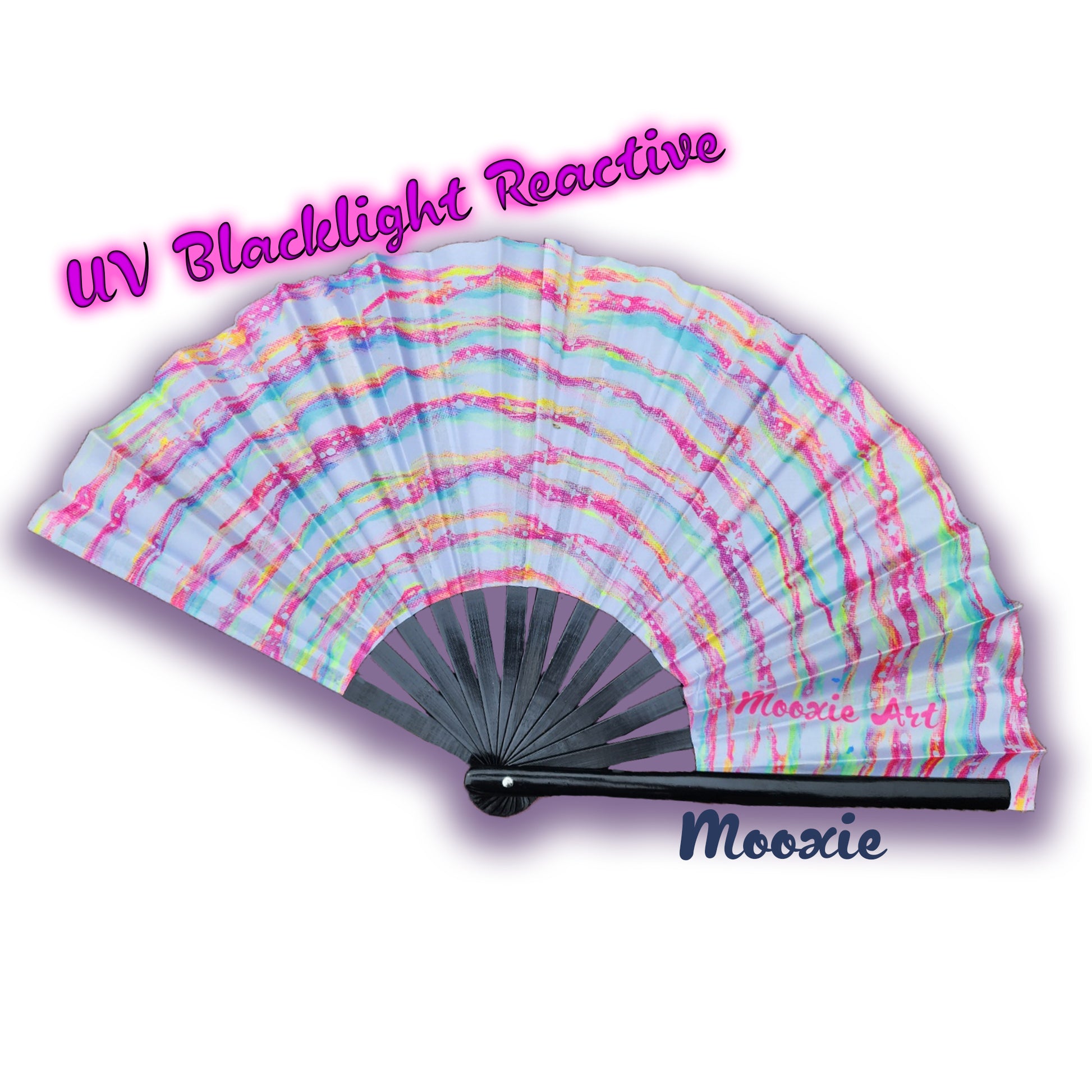13 inch Bamboo UV-reactive hand fan. Measured from base to end when closed. Made from a weather durable fabric. Classic fan style found at raves, festivals and other large events. Produces a strong kick of breeze with minimal effort. Also makes clacking sound when thrown open with a flick of the wrist.