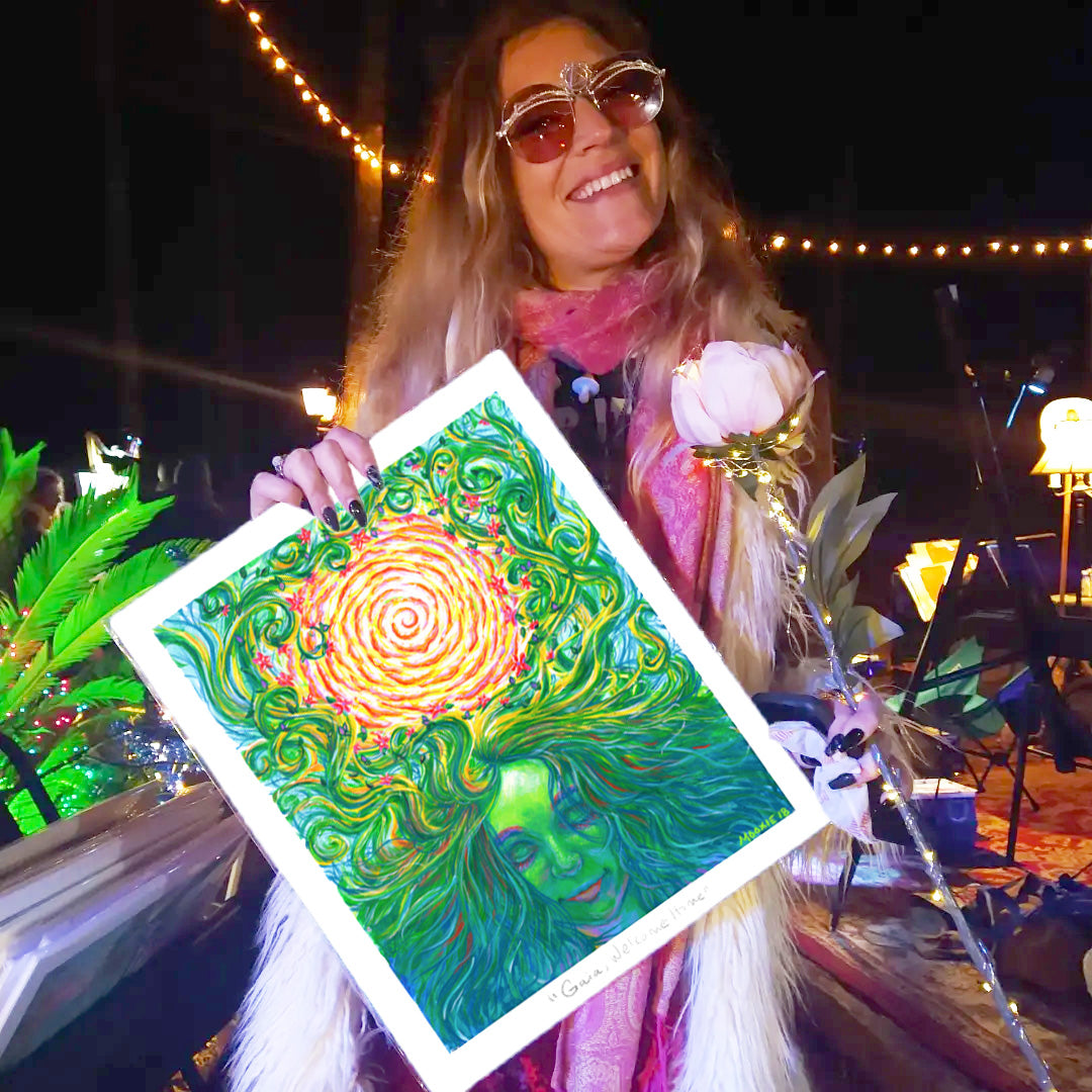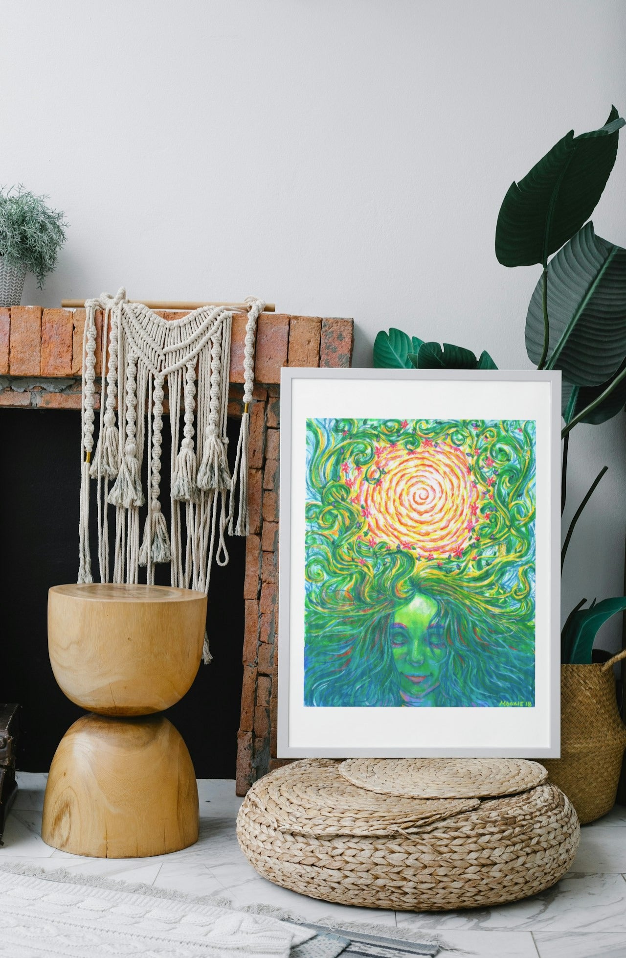 A beautiful giclée art print of an original acrylic painting titled, "Gaia, Welcome Home" (2018). Gaia meditates as vines of hair encircle a sunny portal. Divine feminine consciousness is channeled into this spiritual awakening art and printed with the highest quality material and process to retain it's beauty for years to come. Perfect hippy home decor for a conscious enlightened space and everyday nature lover.